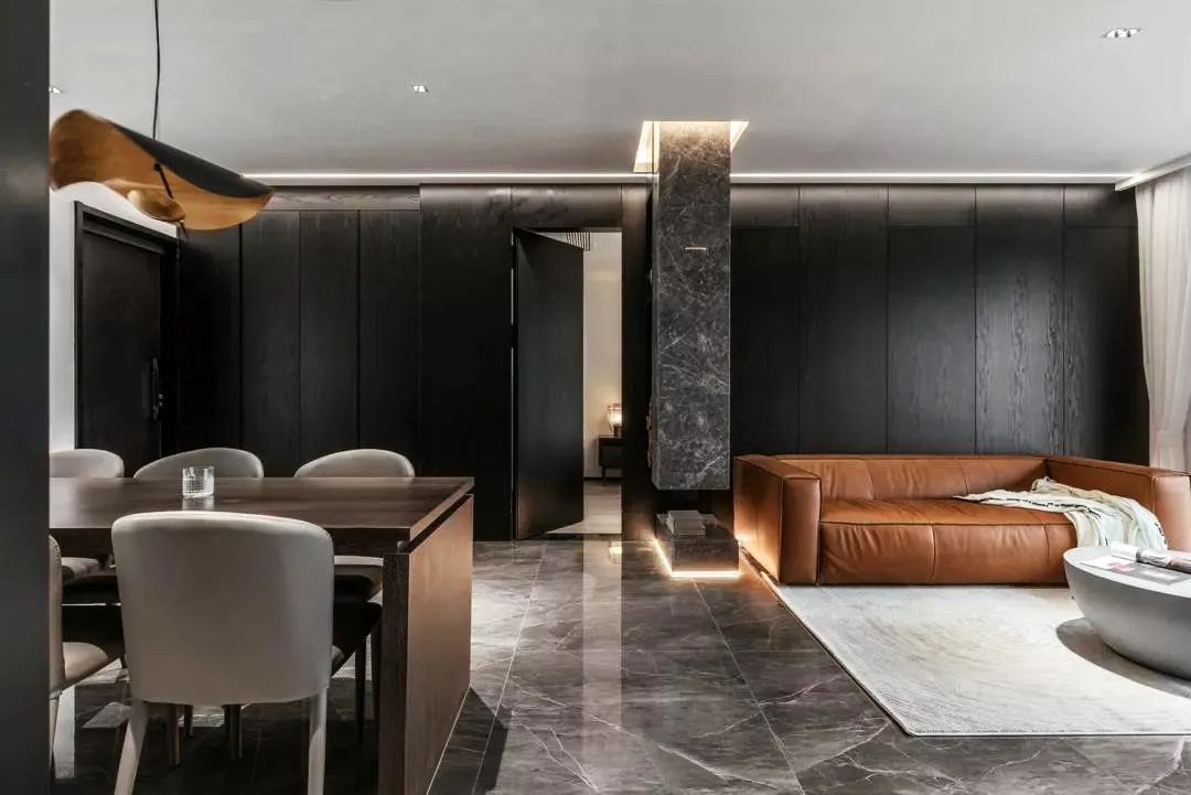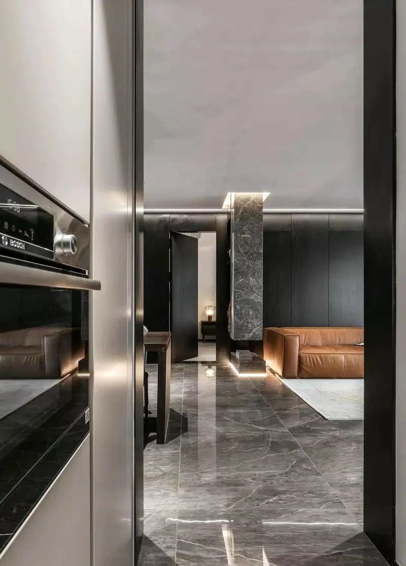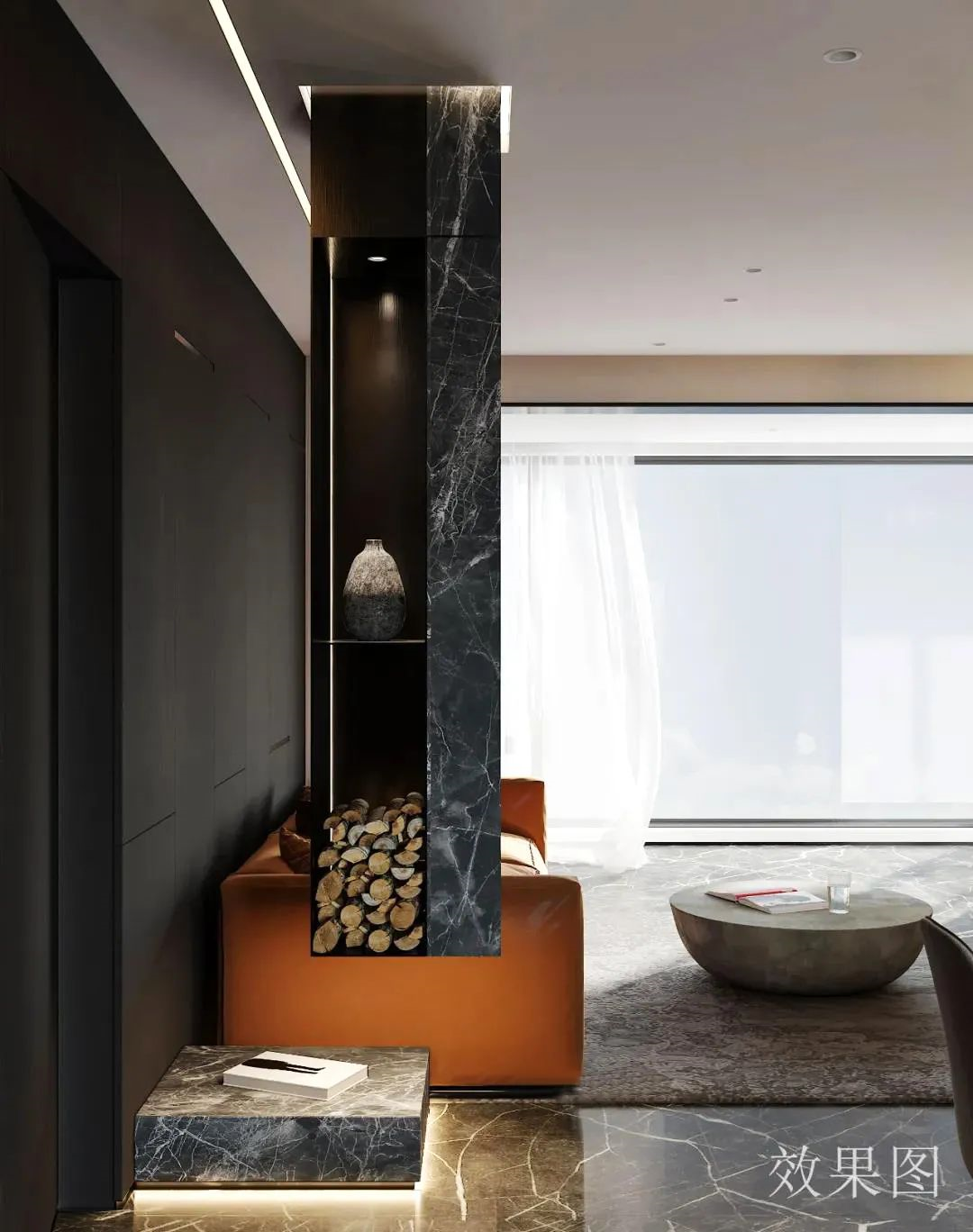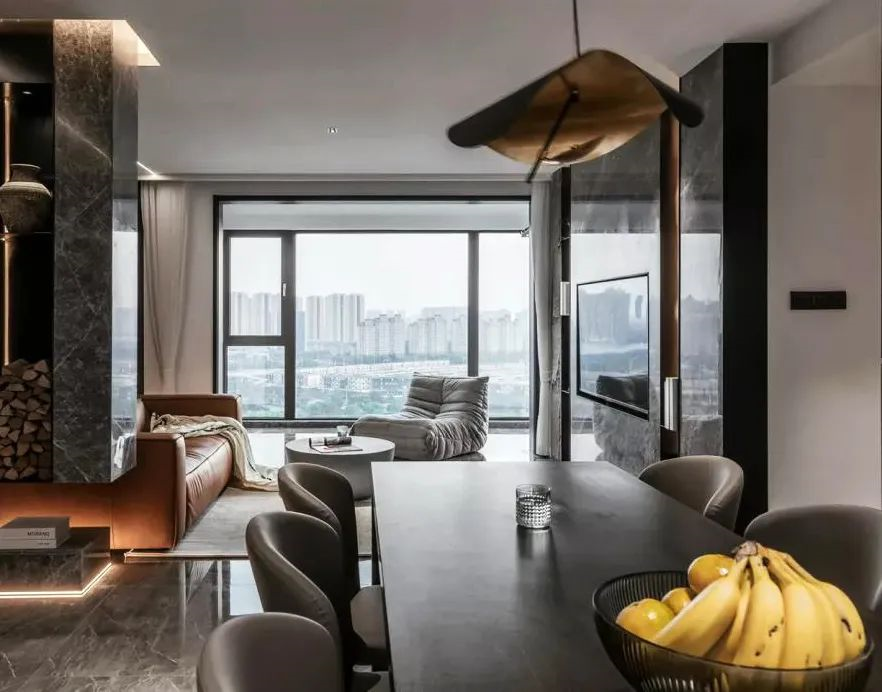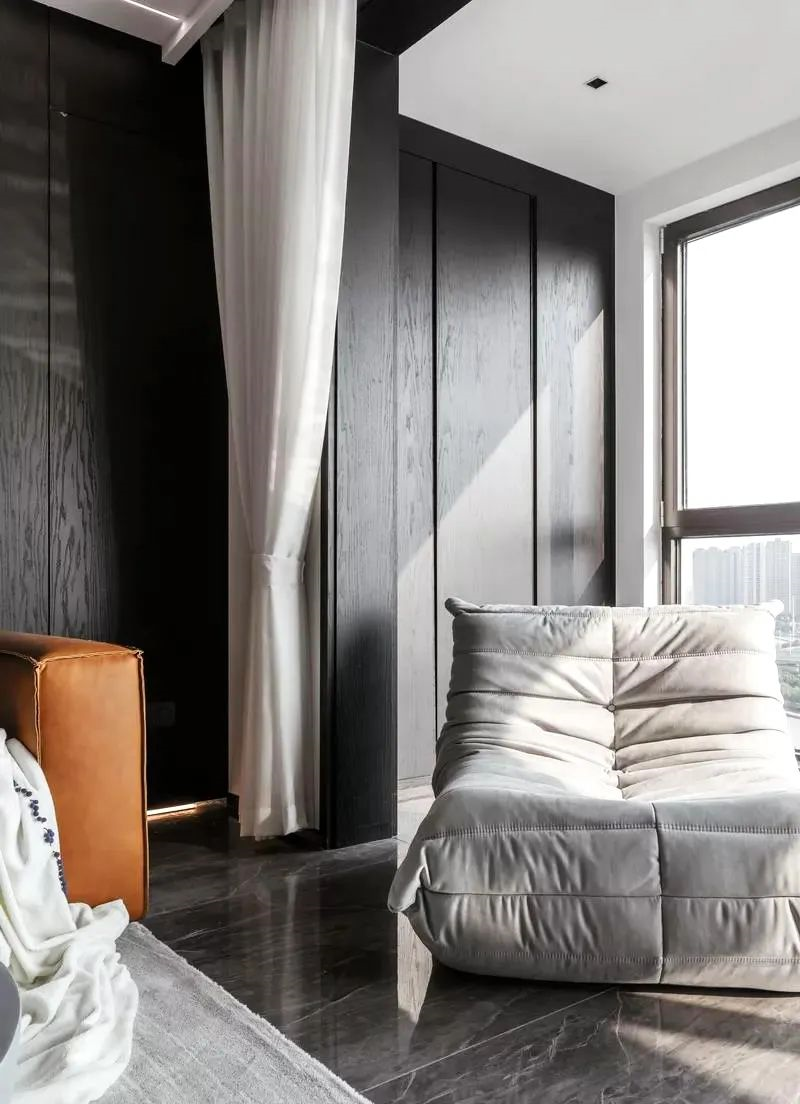無線連紋的地面透出放蕩不羈的氣質,另外用巧妙的軟裝點綴喚醒了活力,在細節處散發出精致的氣質。長條座椅點亮了窗前流線,時不時露出低調奢華的都會時髦感。